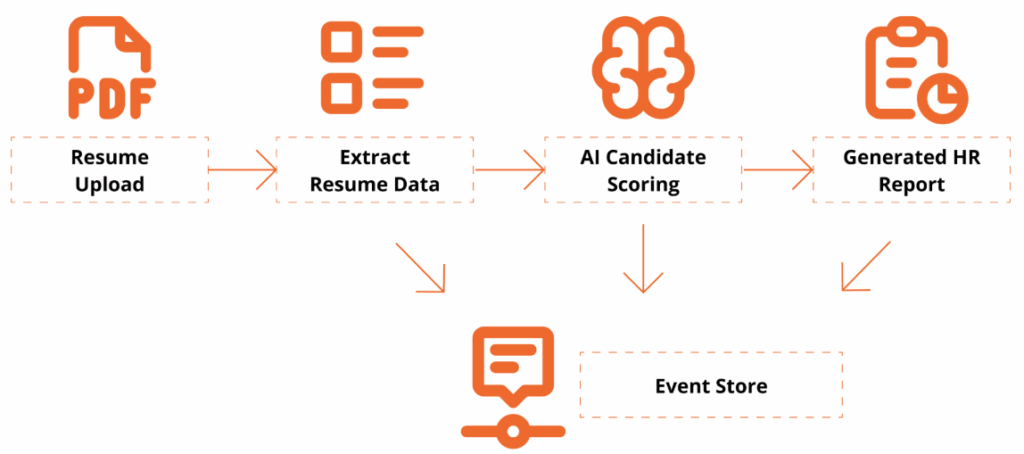 Resume Upload → Extract Resume Data → AI Candidate Scoring → Generate HR Report → Event Store